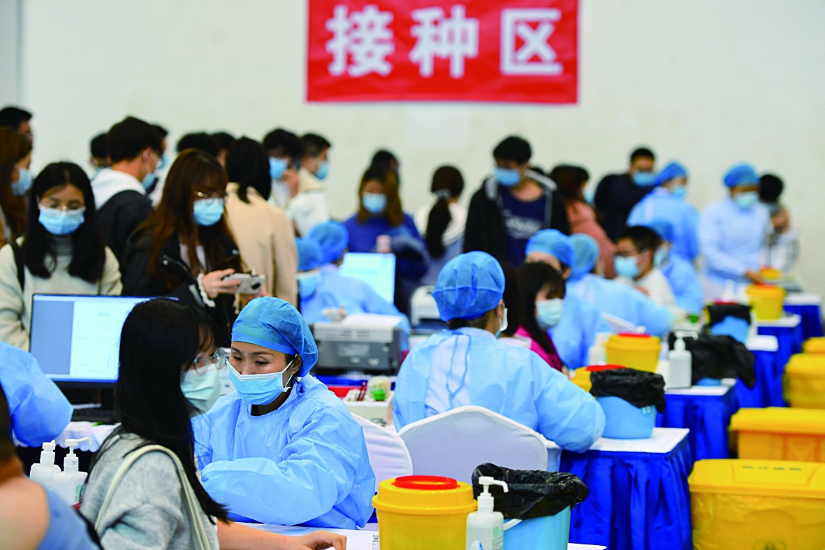 4月1日,在湖南省湘潭市湖南科技大学的“方舱接种点”,湘潭市中心医院的医护人员为师生接种新冠疫苗。 近日,湖南省湘潭市中心医院在湖南科技大学筹建的新冠疫苗“方舱接种点”顺利运行。“方舱接种点”共设置2个接种区,20个接种台,可同时为20人接种新冠疫苗,计划为4万余名师生进行新冠疫苗接种。 新华社记者 陈泽国 摄
