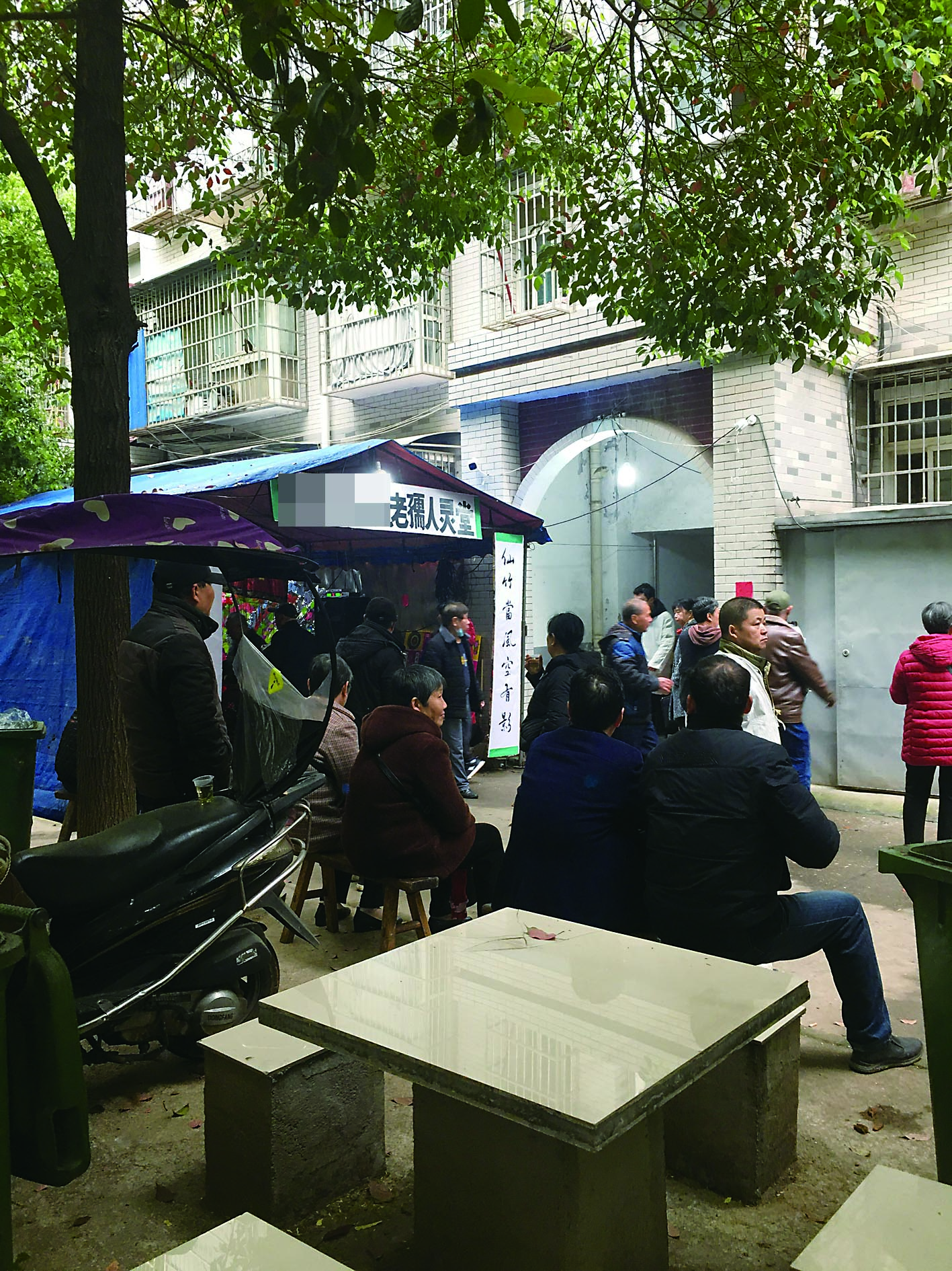 灵堂设在一栋居民楼的楼道口前方,搭设的棚子占据了一条通道。灵堂前聚集了一些居民,灵堂内摆放了多个花圈。