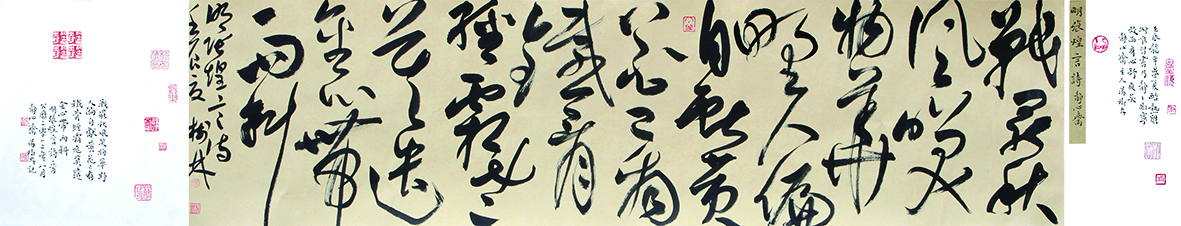 上世纪八十年代末,汤树林被抽调到湖南省首届书法高级研修班研修书法,时间跨度近三年。颜老主导谨严的治学态度:“多写石鼓铜诏、铁权瓦量,上溯源流并承接现代”。史老尝谓书法家之家法:“求文字之根本,必先于古文诗词;文字转写若生谬误,则不得不汰。”邬老则用绘画“虚”与“实”,“整体”与“局部”的绘画理念强调书法创作与绘画的审美关系,鼓励大家不遗余力地建造大体量的“实”,同时也要殚思竭虑地营构小面积的“虚”。他说,“京剧舞台上主角的气派,就是那些跑龙套者烘托出来的。”