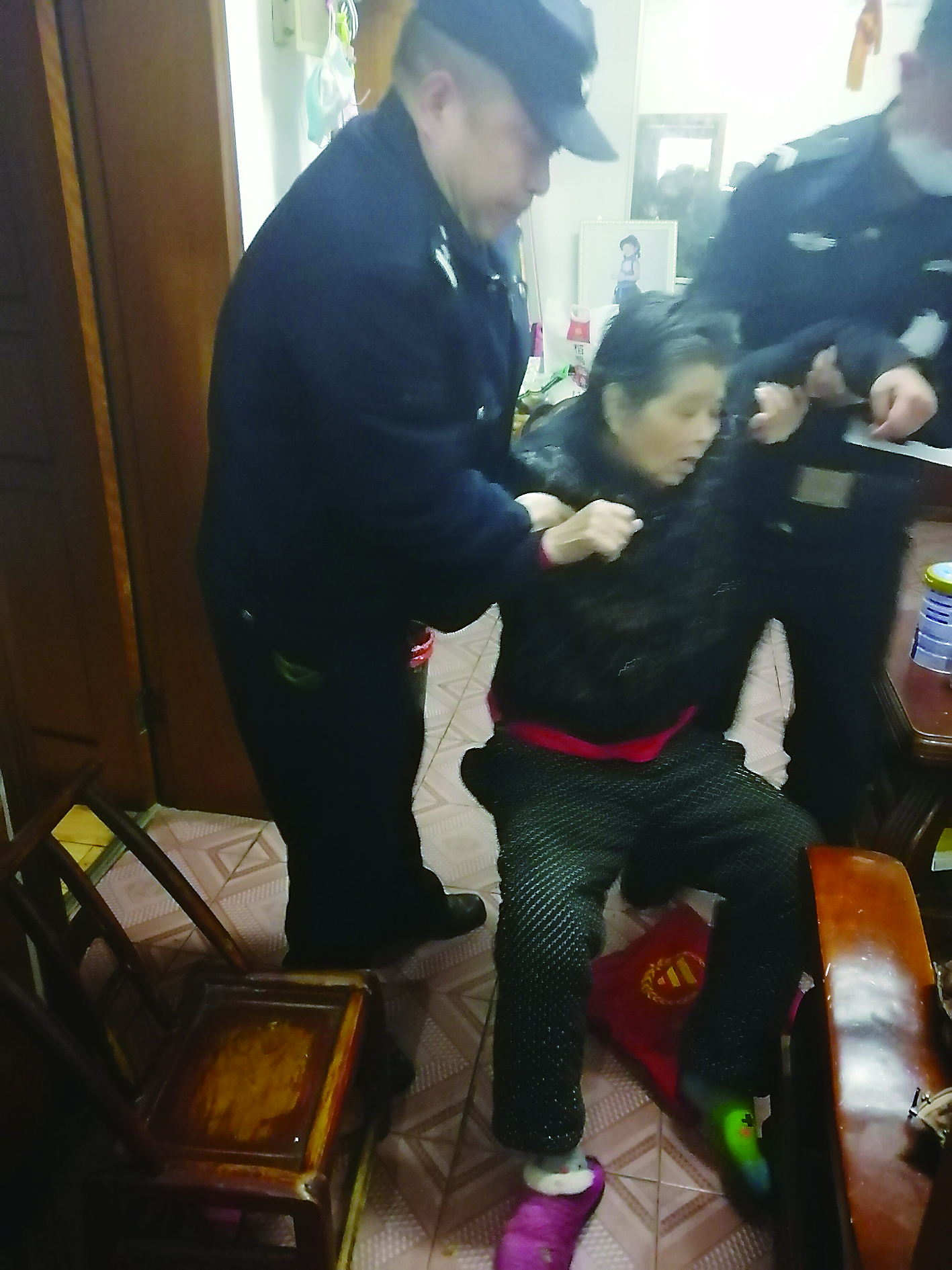 ▲瘫倒在地的老人被众人扶起。 受访人供图