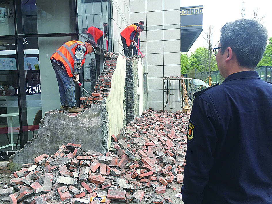 ▲4月6日,施工人员对砖墙实施拆除。 记者 刘平 摄