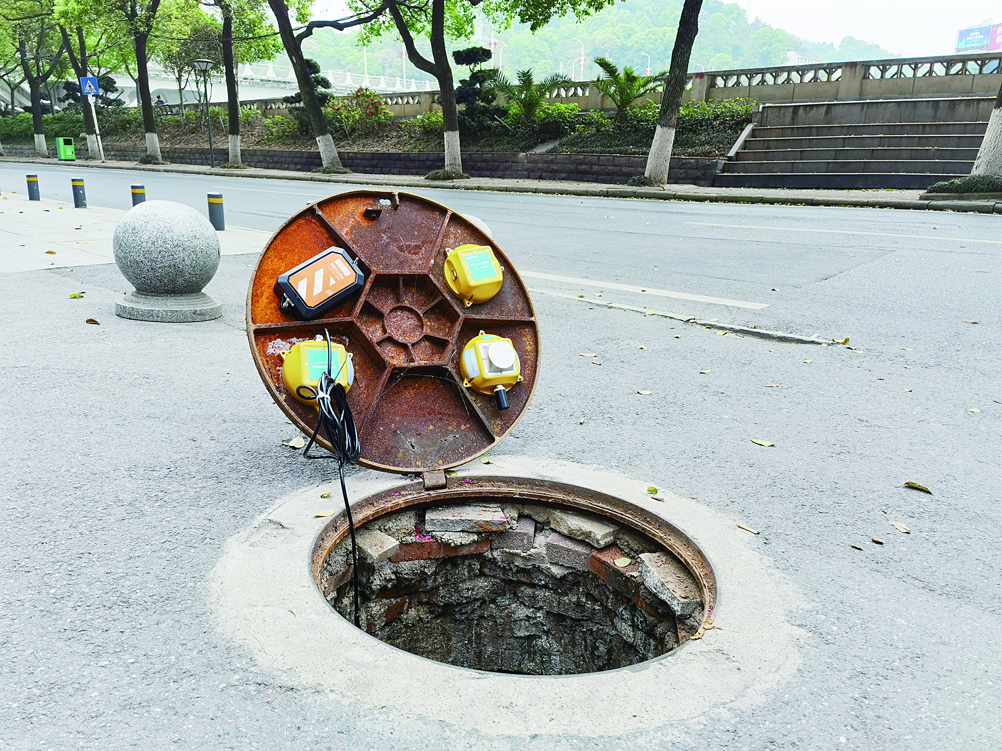 这个圆圆的井盖在路上显得很普通,但掀开一看,井盖下装有4个传感器,分别具备管道水位、井下气体浓度、井盖位置监测等功能。比如,当井盖位置倾斜大于25°,或井下水位达到临界点时,系统会自动报警。平时,城管部门市政队员也可通过手机和电脑,实时监测各项数据,对发现的问题及时进行处置。