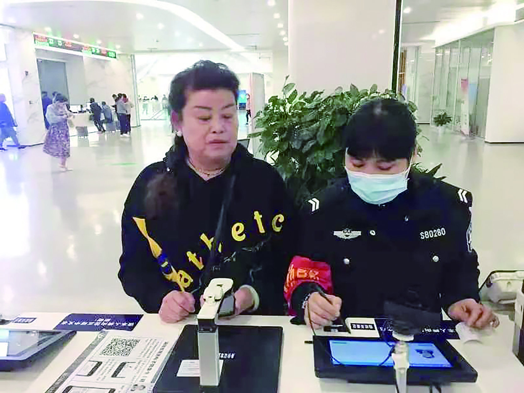 ▲引导员(右)为老年人办理出入境证件提供“一对一”专人服务。 通讯员供图
