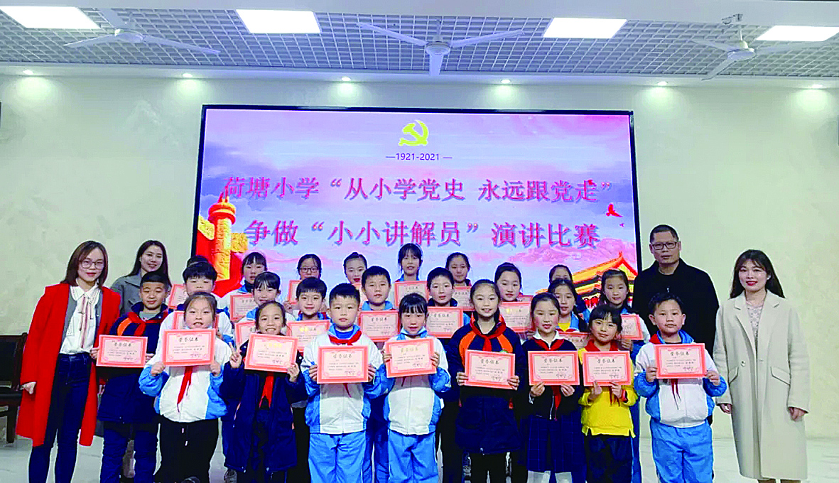 4月7日,荷塘小学在校园举办了以“从小学党史、永远跟党走”争做“小小讲解员”为主题的演讲比赛。比赛中,同学们用激情澎湃的语言、真挚热切的情感,缅怀党的百年光辉历程,讲述身边的英模故事,并结合自己的学习和亲身感受,从热爱学习、坚定理想信仰、肩负时代使命责任等多个角度、多个层面讲述了自己对学党史、跟党走的理解和看法,充分展示了新时代学生积极乐观、健康向上的形象和风采。