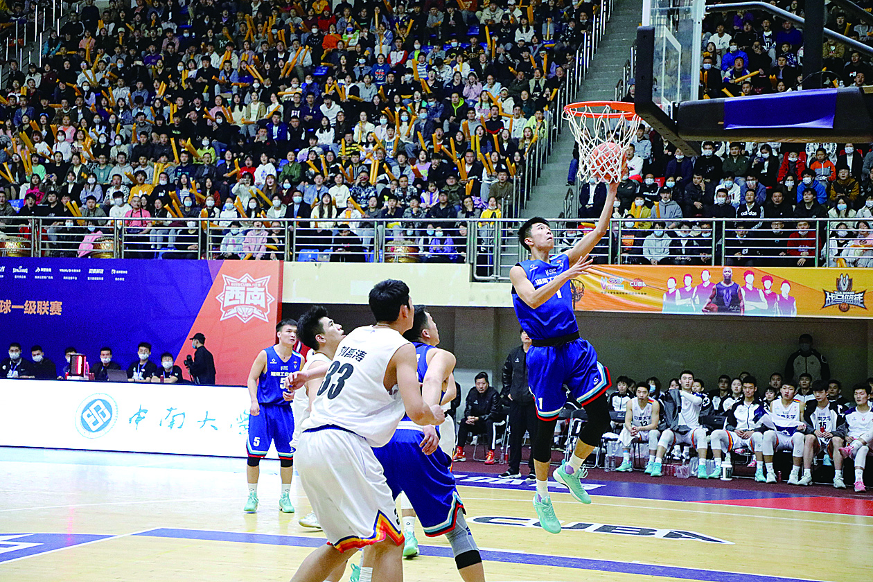 ▲在CUBA西南赛区分区赛决赛上,湖南工大球员奋勇拼搏。 记者 李翰 摄