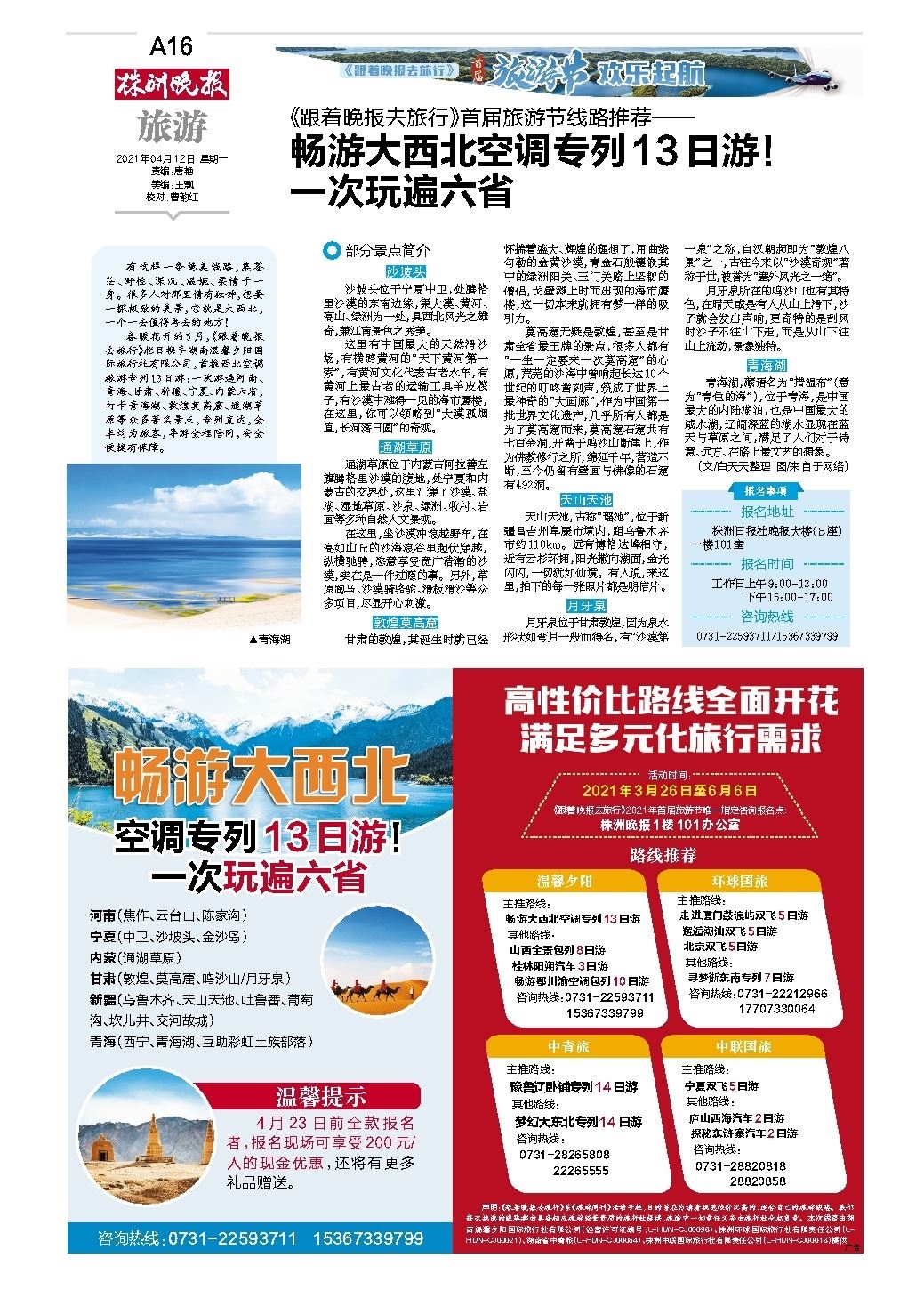 春暖花开的5月,《跟着晚报去旅行》栏目携手湖南温馨夕阳国际旅行社有限公司,首推西北空调旅游专列13日游:一次游遍河南、青海、甘肃、新疆、宁夏、内蒙六省,打卡青海湖、敦煌莫高窟、通湖草原等众多著名景点,专列直达,全车均为旅客,导游全程陪同,安全便捷有保障。