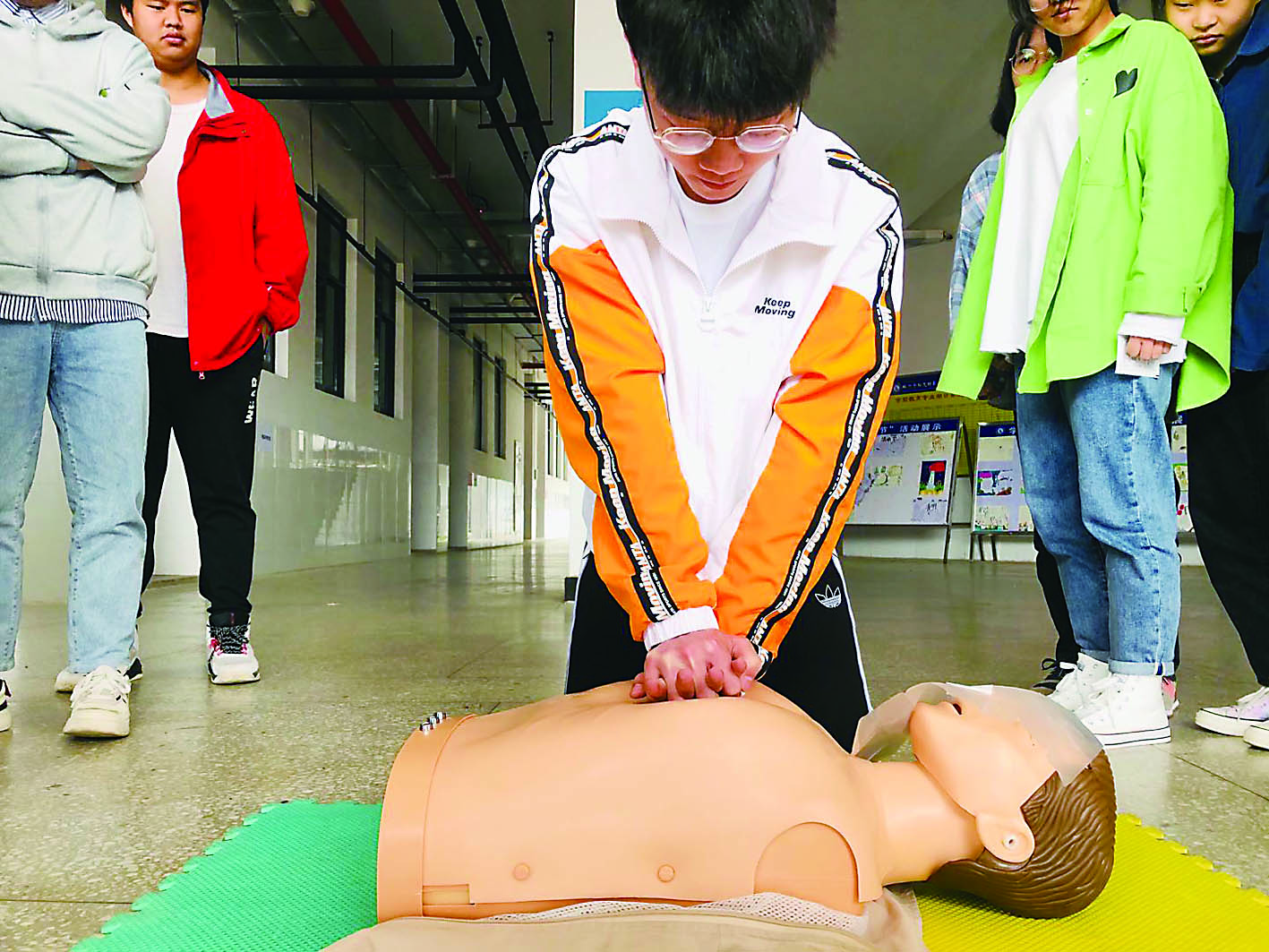 ▲学生进行心肺复苏模拟演练。记者 易楚曈 摄