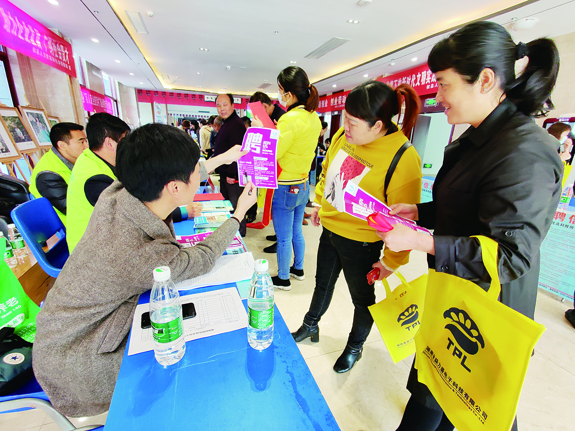 ▲企业工作人员向求职者介绍招聘条件。记者 马文章 摄