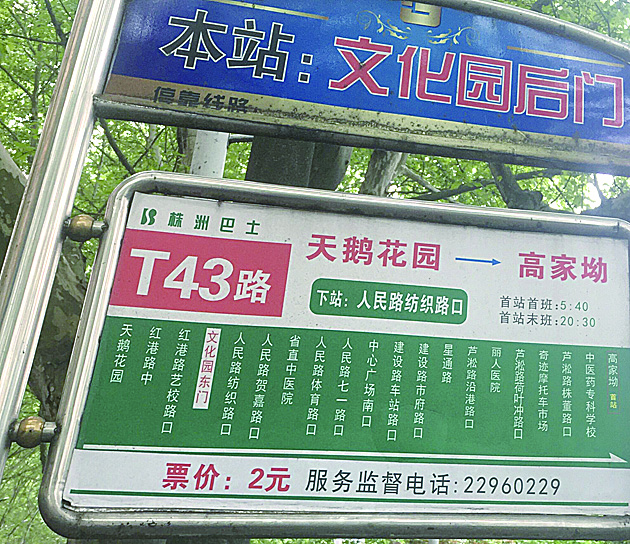 ▲T43路公交线路将“文化园后门”标注为“文化园东门”。 记者 刘平 摄