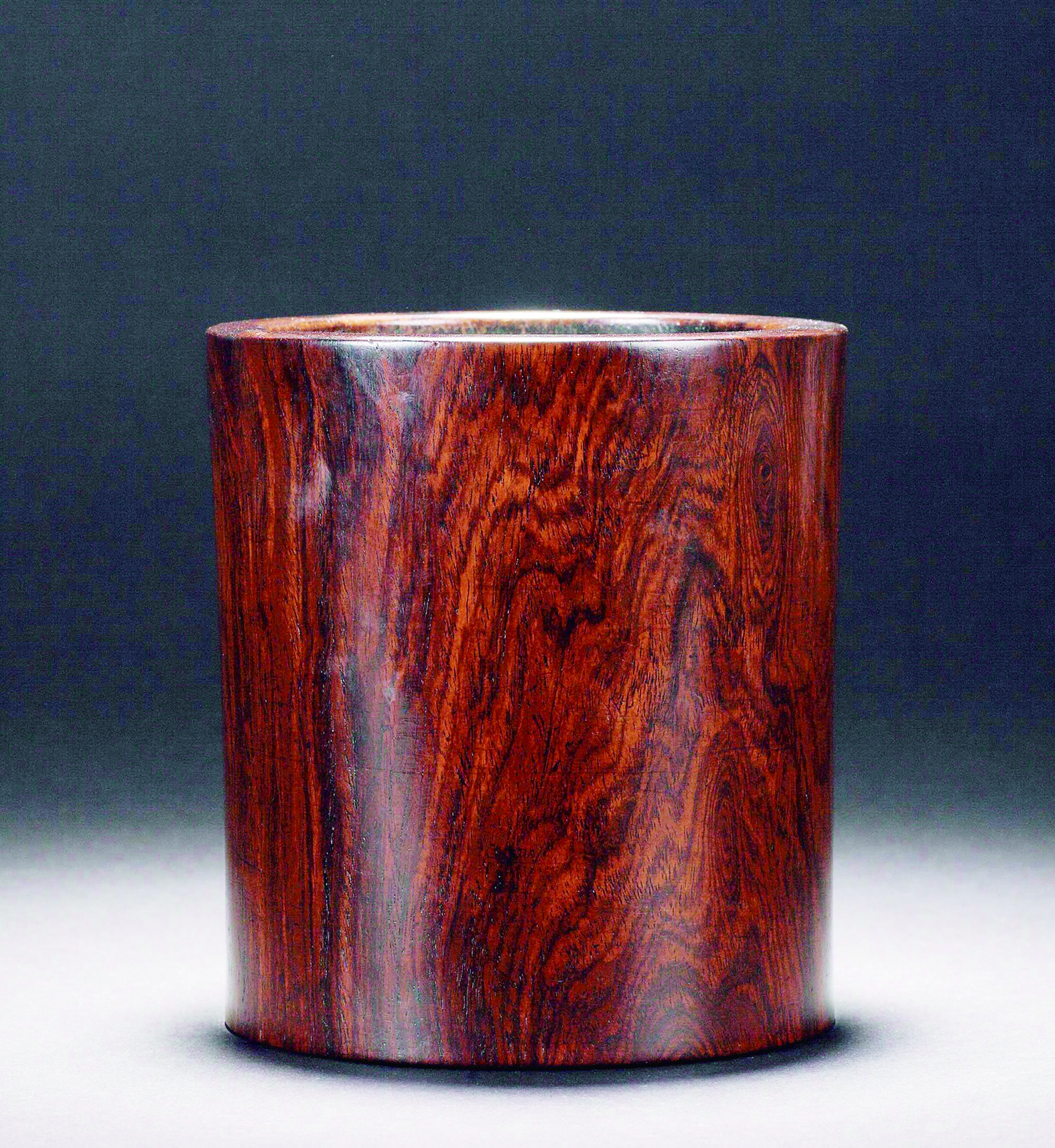 ◀黄花梨笔筒。