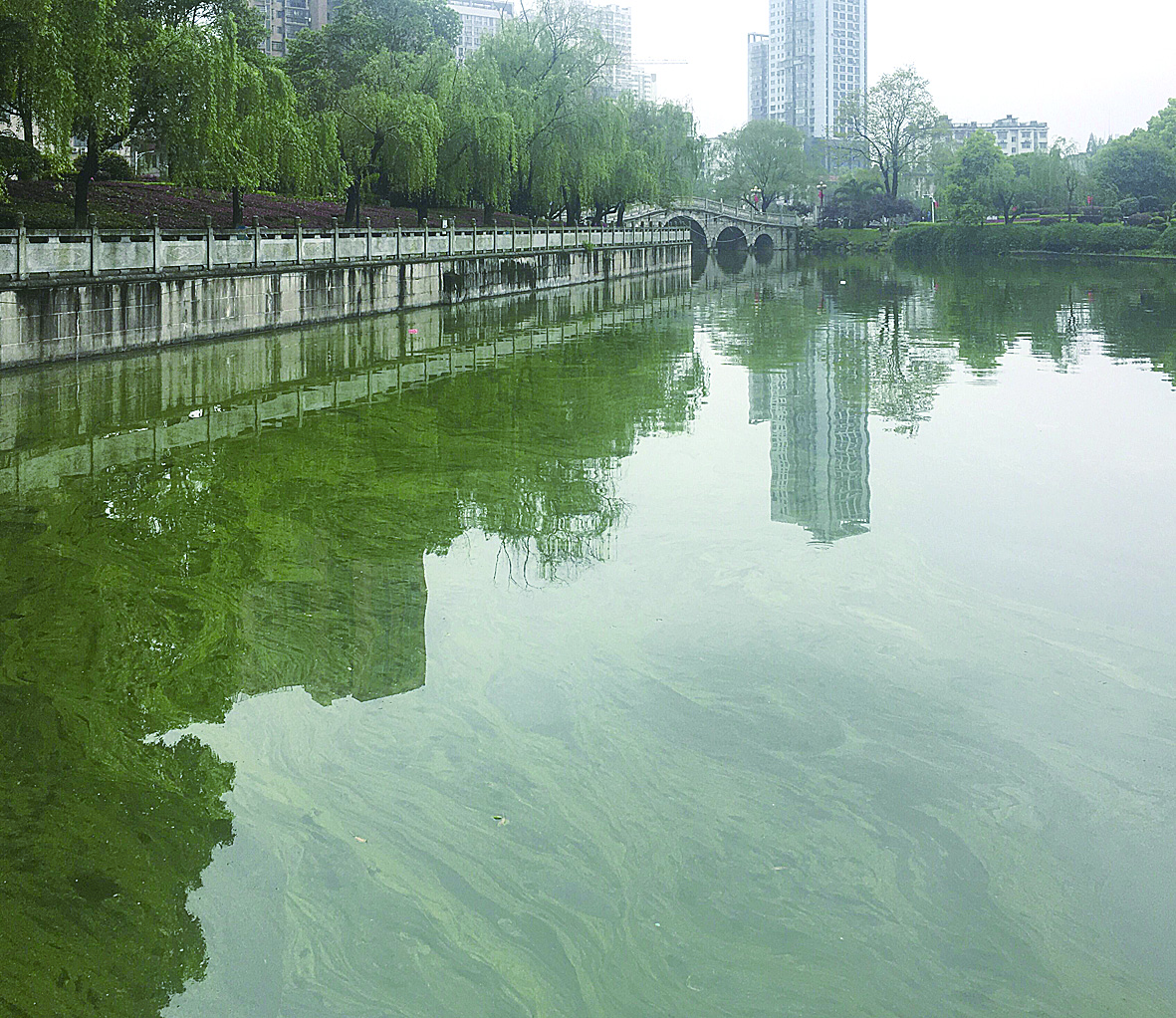 绿油油的湖面……4月13日,芦淞区文化园湖面漂浮蓝藻,出现泛绿现象,引起游园市民关注。
