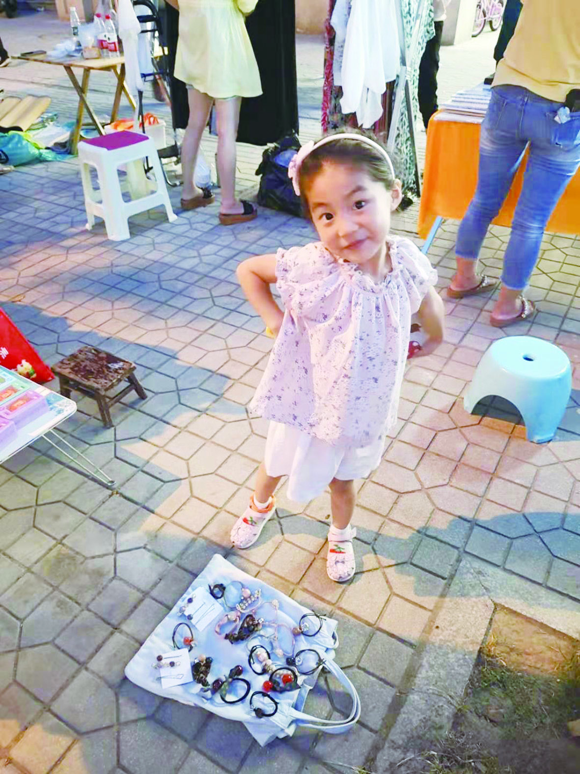 隔壁摊位的小姐姐忍不住朝伊砣这看,伊砣立马拿出两个她喜欢的发圈递过去。小姐姐向她妈妈投出渴望的眼神,我趁热打铁:“这两个只要5块,很便宜,我还送你一个。”那晚,在我和伊砣的默契配合下,成功将两个发圈推销出去了。