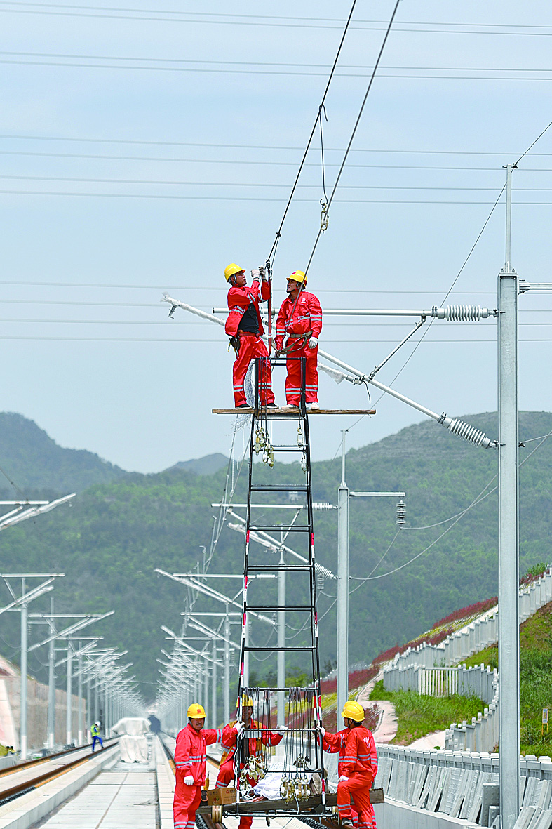 4月18日,施工人员在杭绍台铁路上进行接触网导线调整作业。 当日,由中国中铁电气化局参建的杭绍台铁路在浙江天台县开始架设第一条接触网导线,标志着杭绍台铁路电气化工程进入核心技术施工阶段。据了解,杭绍台铁路全部接触网导线架设及调整施工计划于7月底完成。 杭绍台铁路是我国首条民营资本控股的高速铁路项目。该线路连接浙江杭州、绍兴和台州三地,线路设计时速350公里。新华社记者 黄宗治 摄