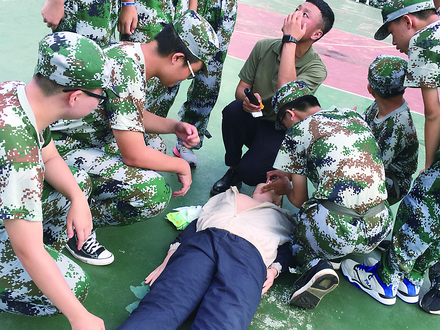 据了解,《军训大纲》规定,高中阶段学生军事训练教学时间为7至14天,总计不得少于7天共56课时。其中,基本军事知识共24课时,人民军队、现代国防、军兵种知识均为必训科目;基本军事技能共88课时,队列动作、战术动作、格斗基础与军事体育、卫生与救护为必训科目,还增加了轻武器射击和投弹科目(可选择模拟训练)等选训科目。其中,心肺复苏被列入基本军事技能中卫生与救护科目教学内容。
