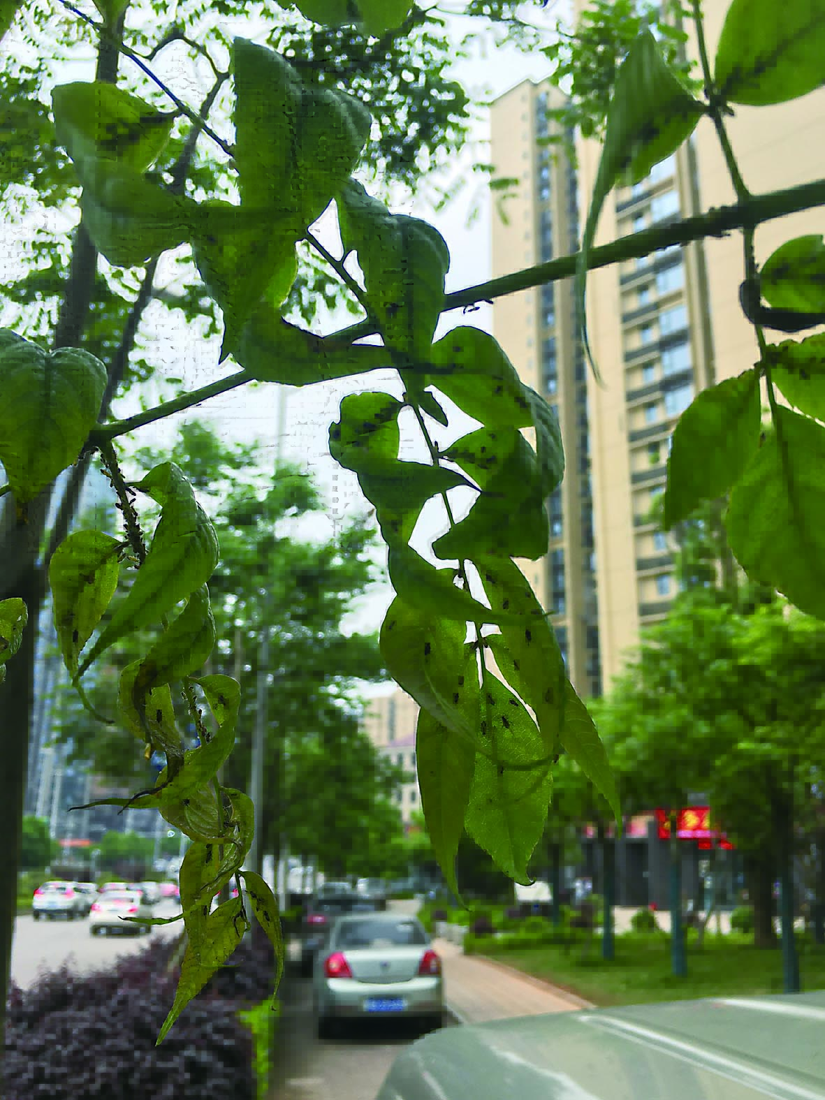 4月21日,天气晴朗,但有市民在荷塘区新塘路新桂未来小区路段的人行道上散步时感受到了“毛毛雨”。原来,路边的行道树为栾树,树枝及树叶上出现大量蚜虫。 图为栾树树叶上的小黑点——蚜虫。 (株洲晚报融媒体记者 刘平 实习生 陈俞汐 文/图)