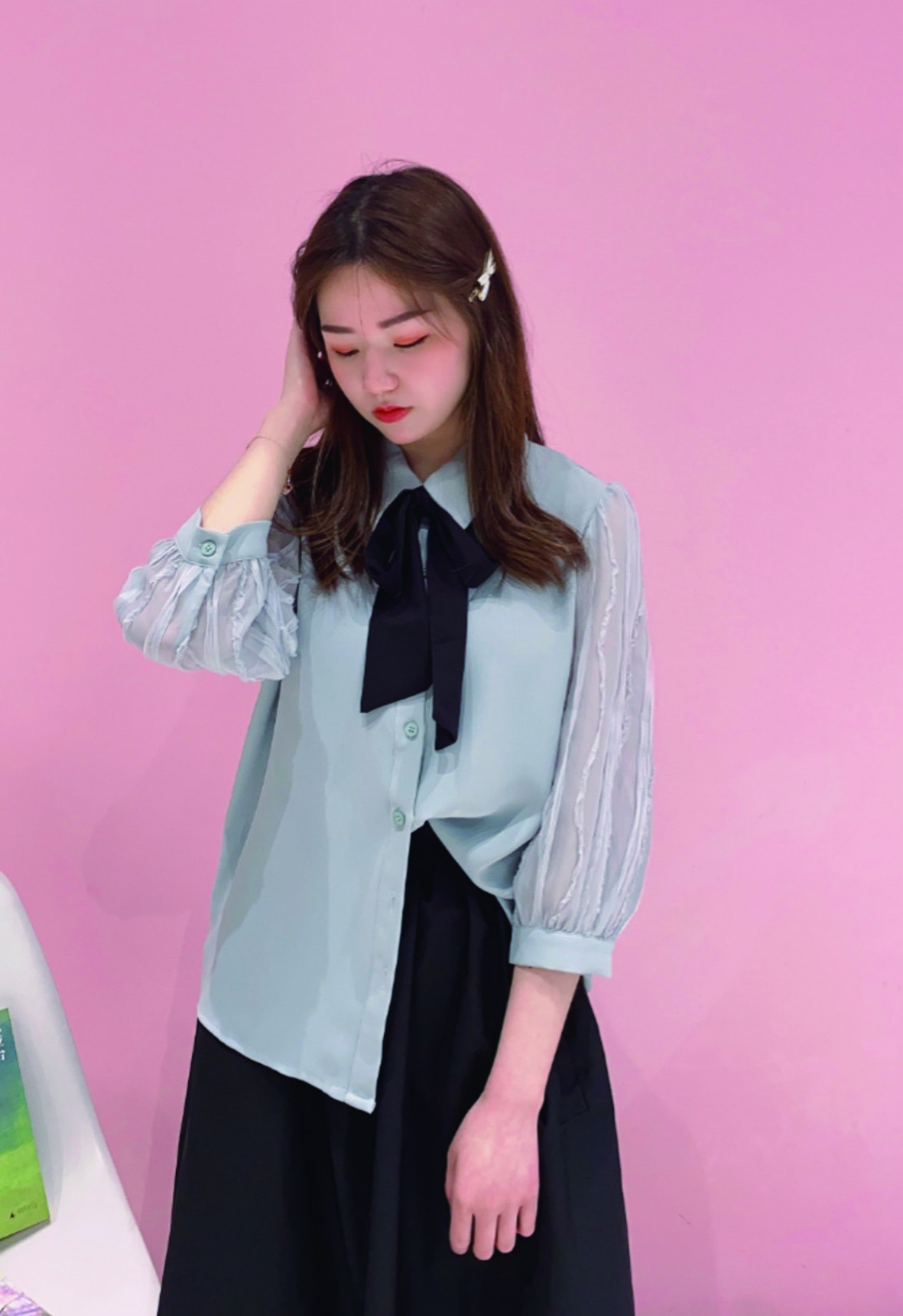 像模特身上这套中袖衬衫,面料柔滑垂坠,通过泡泡袖口氤氲童话般的纯真意味,彰显优雅气息,但同色系的藏蓝色领结有些甜美,又不失大气,让人很有记忆点。