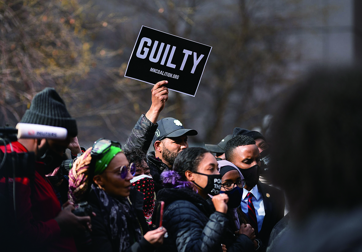 ▲4月20日,民众手举“有罪”的标语聚集在美国明尼阿波利斯市的法庭附近。 新华社发(本·布鲁尔 摄)