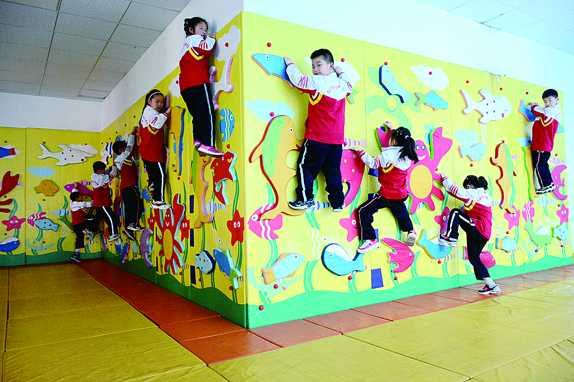 ▲市外国语石峰学校内,孩子们利用课间10分钟“攀岩”。 记者 何春林 摄