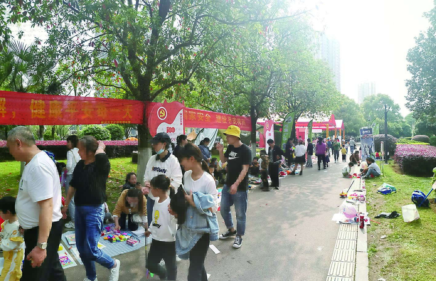 书香集市上集中展示了各种书籍,还设置了少儿活动体验区等。