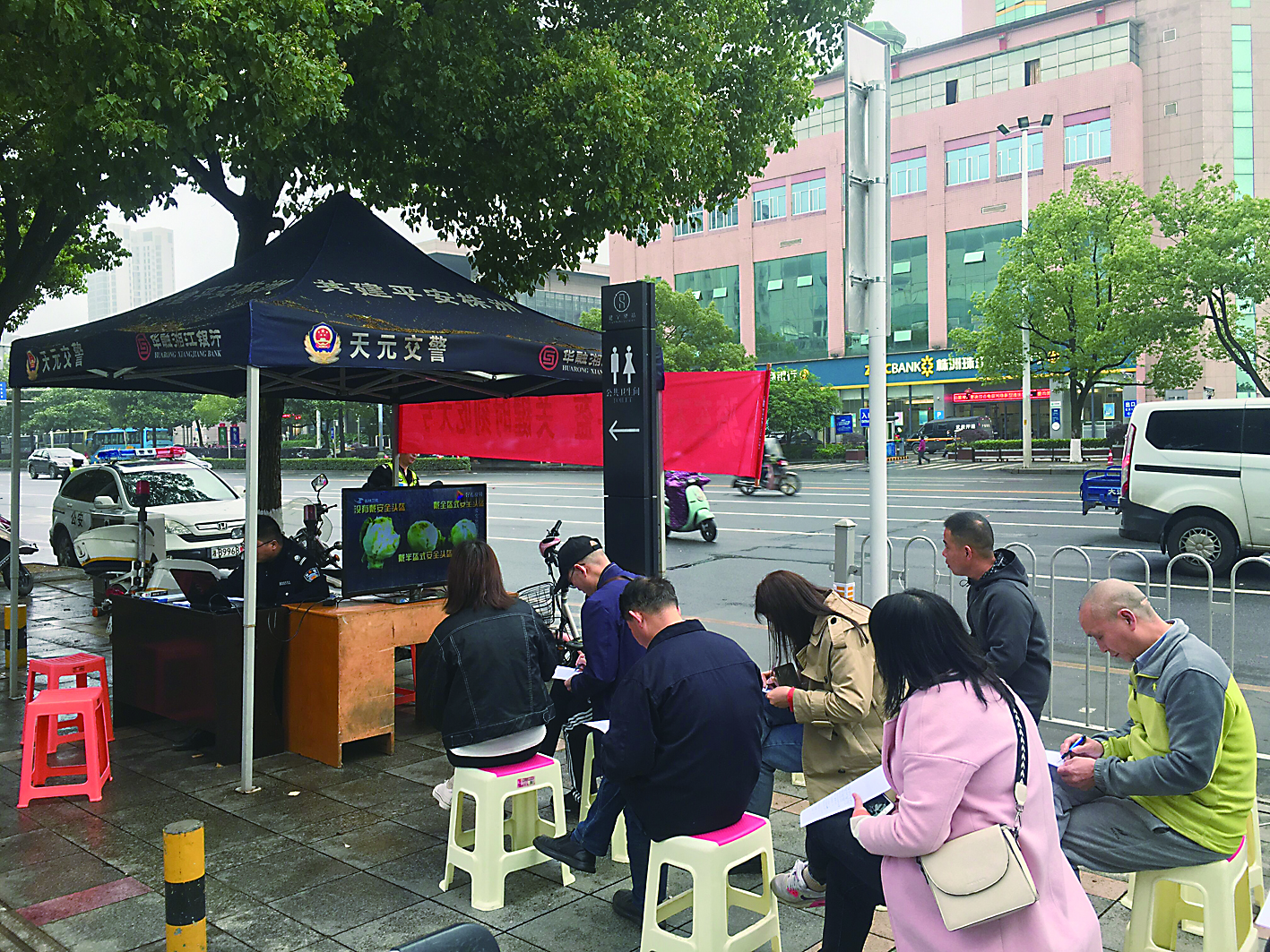 ▲未戴安全头盔,驾驶员在街头集体学习,接受教育。 记者 刘平 摄