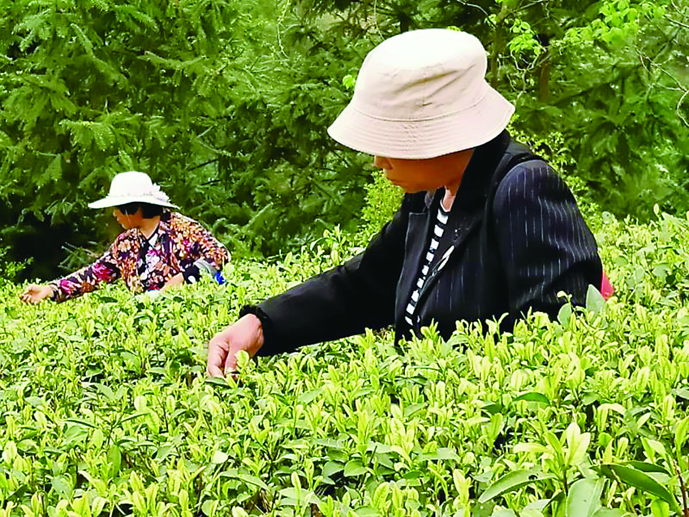 ▲采茶工趁着晴好天气忙采茶。 记者 刘毅 摄