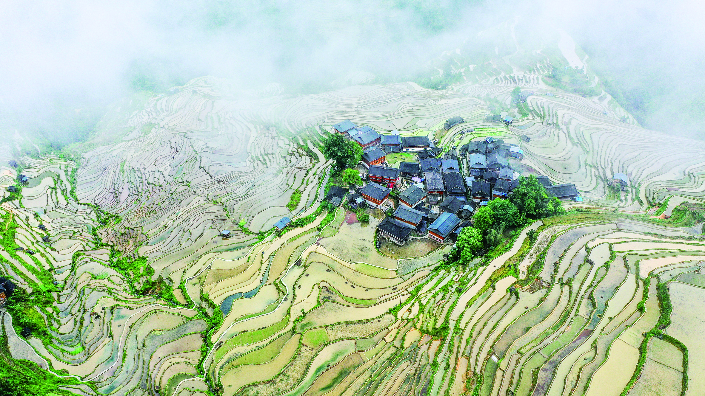 立夏前后,位于贵州省黔东南苗族侗族自治州从江县大山深处的加榜梯田蓄水丰盈、线条分明。青山环抱着梯田,苗寨点缀其间,在不同的光线下呈现出不同色彩,如诗如画。 (新华社记者 杨文斌 摄)