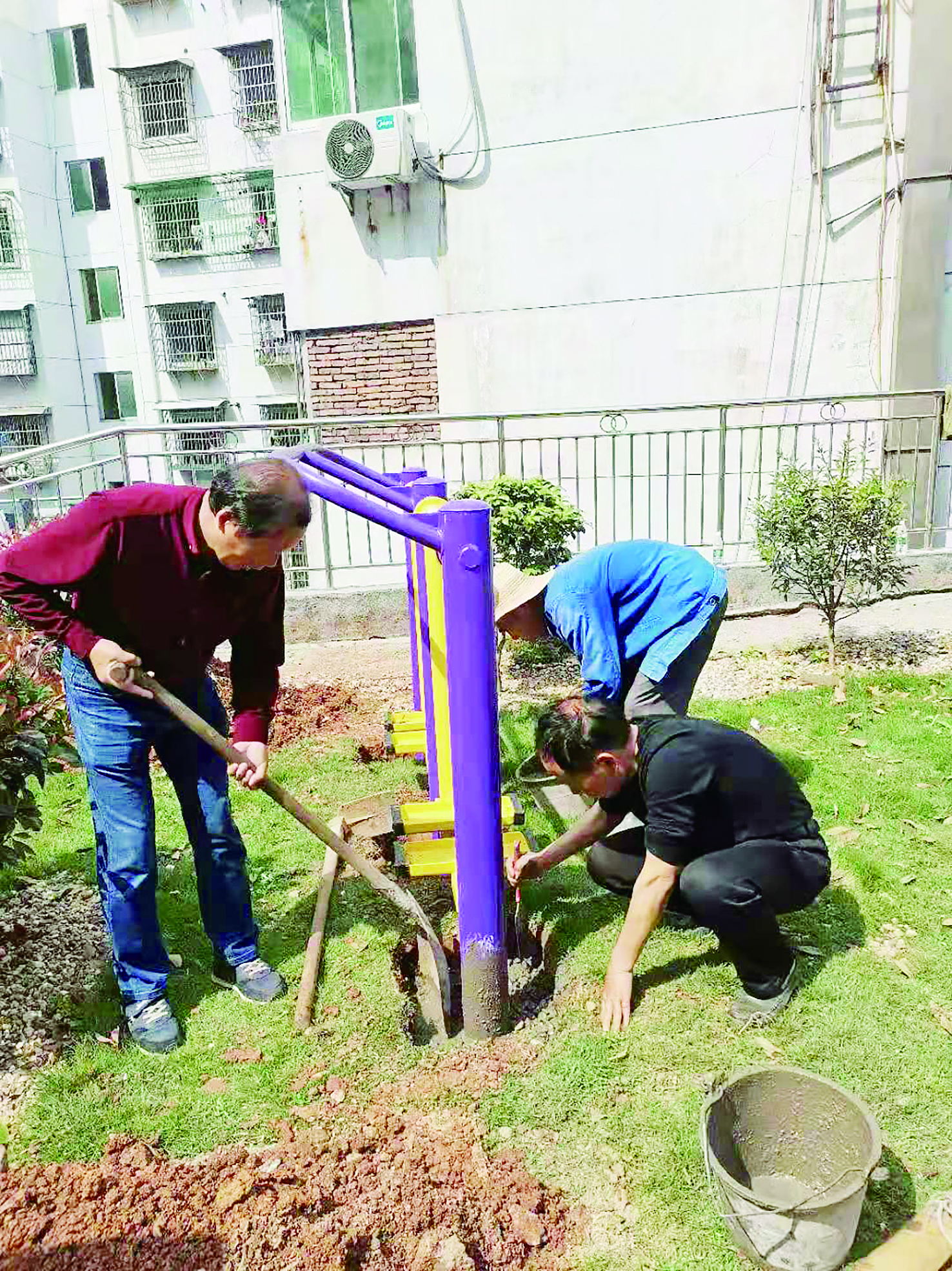 ▲小区居民在安装健身器材。 记者 杨凌凌 摄