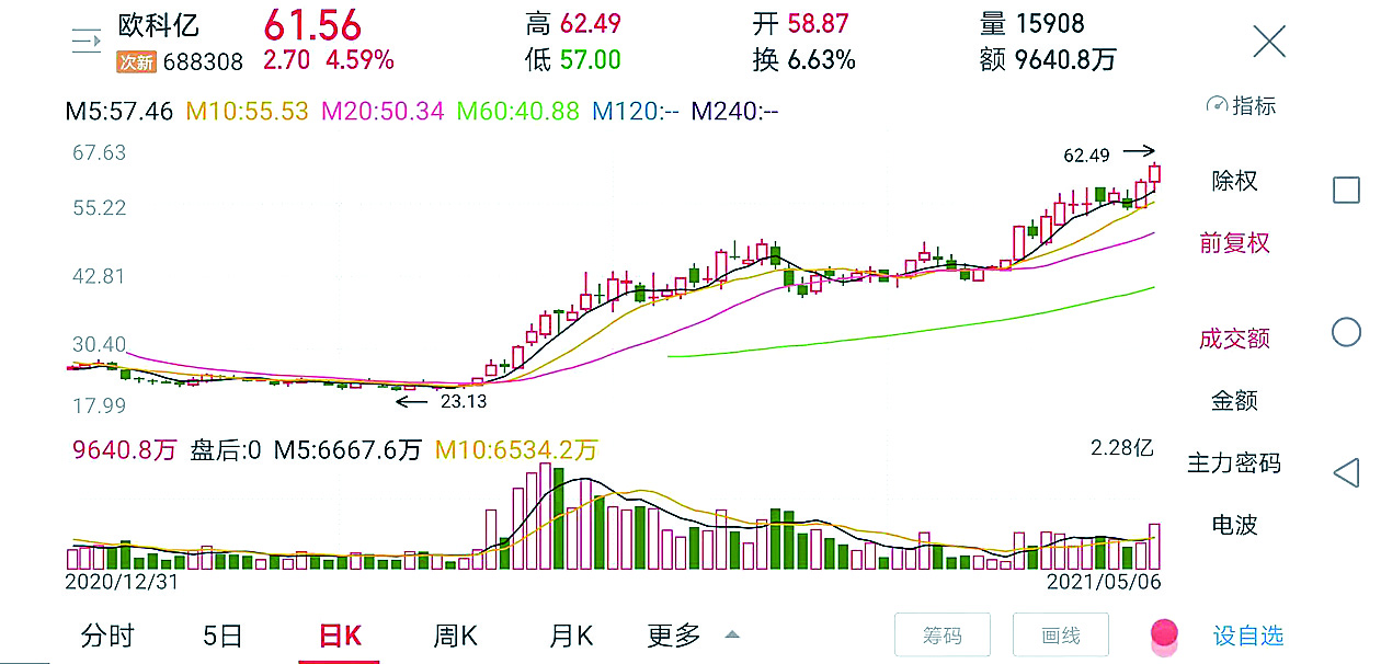 良好的业绩体现到股价上,当然是“不停涨”“涨不停”。华锐精密2月8日上市后,股价从95元/股涨至5月6日的141.72元/股,涨幅达49.18%。从春节后来看,涨幅更是高达120.6%。欧科亿表现更是惊人,从1月4日的27.24元/股涨至5月6日的61.56元/股,涨幅达126.0%,从春节后来看,涨幅达162.0%。