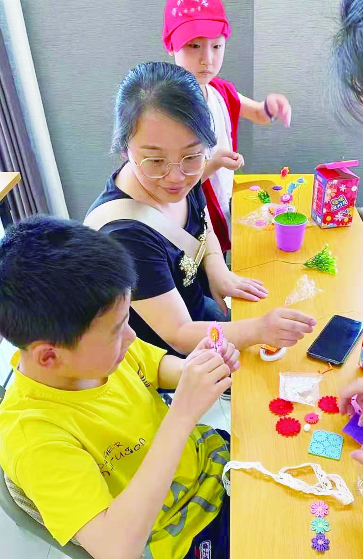 ▲在花艺师指导下,第一次学习插花。 ▼手工课堂,也收获温馨时光。