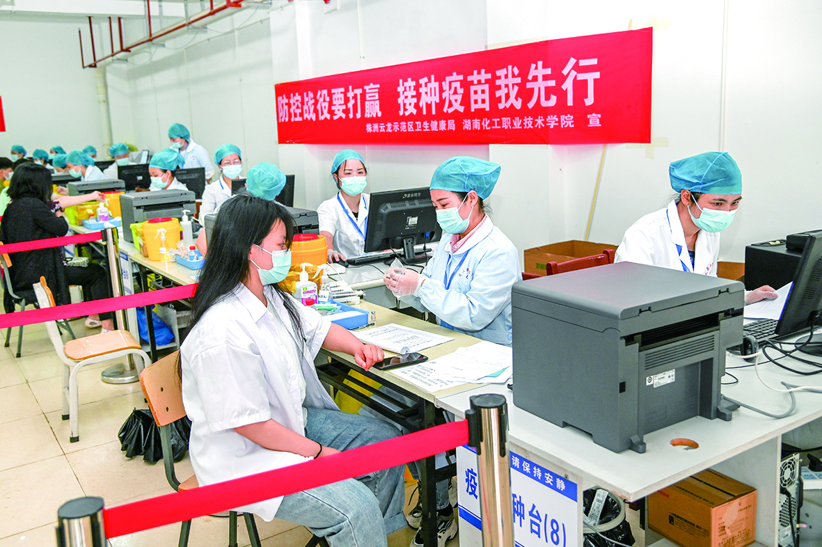 ▲在湖南化工职院临时接种点,学生正在接种新冠病毒疫苗。通讯员 何勇 摄