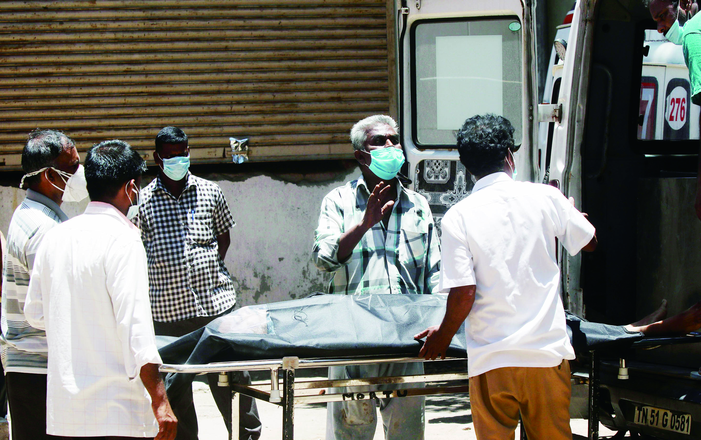 5月8日,在印度金奈的一所医院,亲属转移新冠病逝者的遗体。