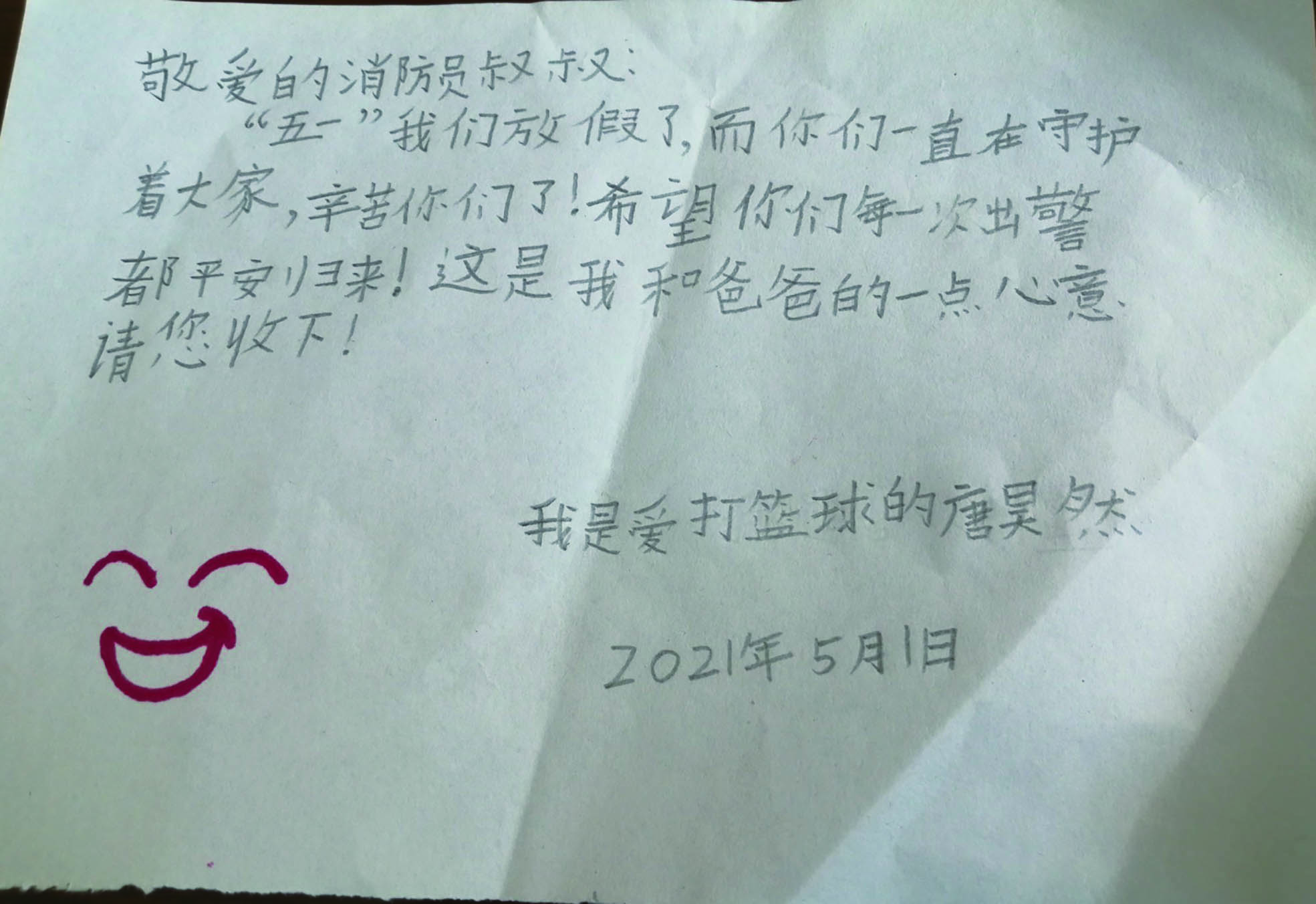 据介绍,这是一对父子,他俩为消防员送来了王老吉、西瓜等食品,随着礼物一起的还有一封信,信中写道:“五一”我们放假了,而你们一直在守护着大家。希望你们每一次出警都平安归来,这是我和爸爸的一点小心意,请您收下!落款是“爱打篮球的唐昊然”。