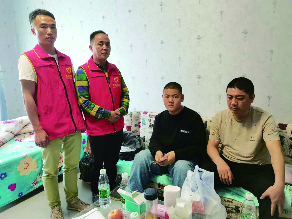 ▲志愿者来到谢佳伟(左三)居住的出租屋中看望他。通讯员供图
