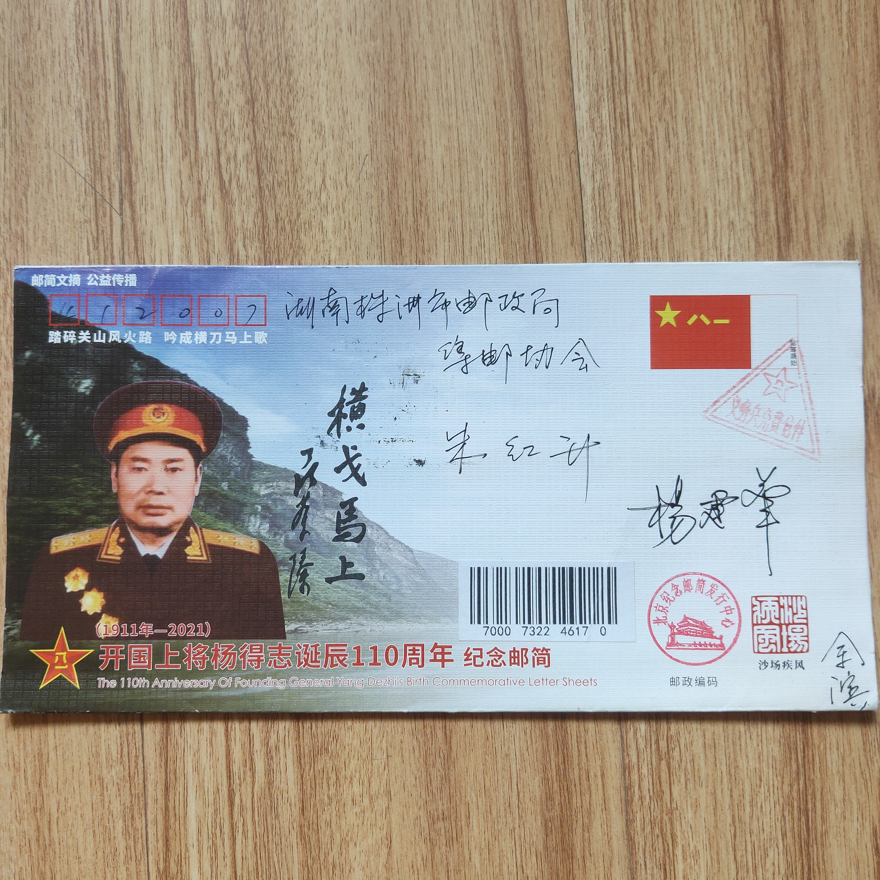 印数上,最开始的计划是印制1000枚,带编号,但考虑到红色藏品在收藏上的需求,最终印制了3000枚。邮简在发行当天就全部订完,过后陆续又有全国各地的邮友联系,说想要订购,但因为已售罄,不再重印,只得作罢。4月3日,开国上将杨得志诞辰110周年纪念邮简首发纪念活动如期在渌口区南阳桥杨得志故居隆重举行,我受邀参加,十分荣幸。随后,还收到了杨建华少将寄来的签名封。