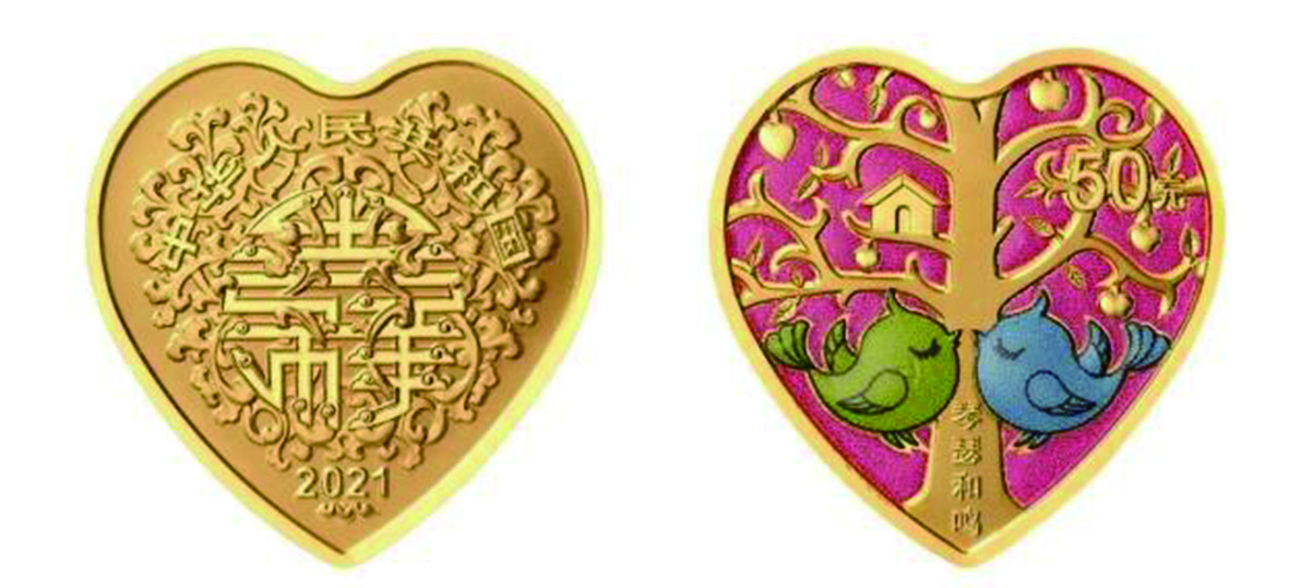 一枚是3克心形金质“琴瑟和鸣”纪念币。背面图案为两只小鸟、树、果实等组合图案,刊有“琴瑟和鸣”字样,含纯金3克,外接正方形边长18毫米,面额50元,最大发行量20000枚。