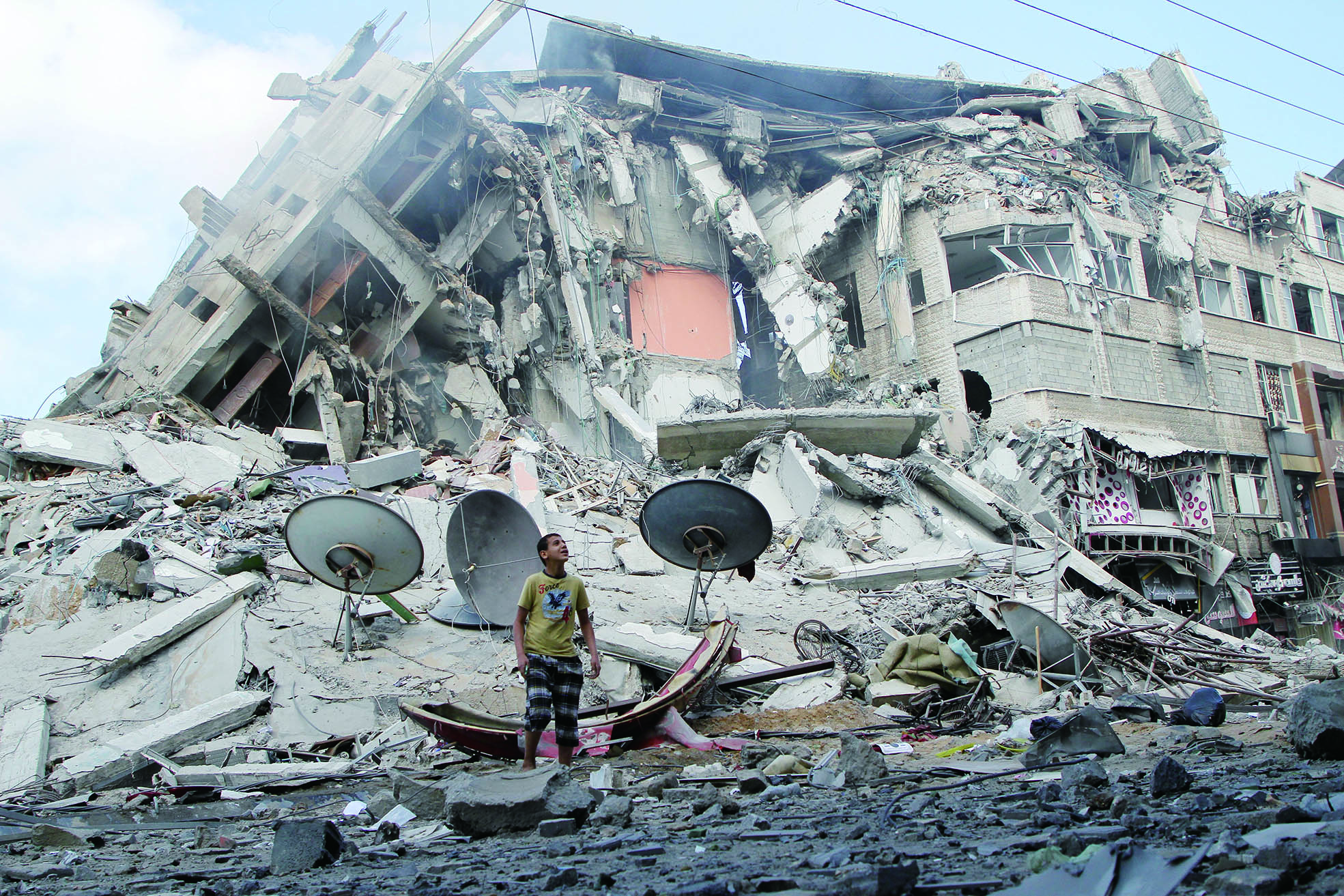 ◀5月13日,一名巴勒斯坦男孩查看以军空袭造成的破坏情况。