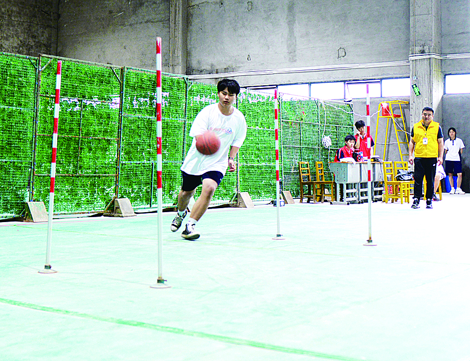 跑道内的塑胶草坪上,来自三门镇中学的肖馨正在准备自选考试项目——足球。出发令响起,她利落带球,成S形依次绕过5根障碍栏杆。11.6秒,成绩还不错。