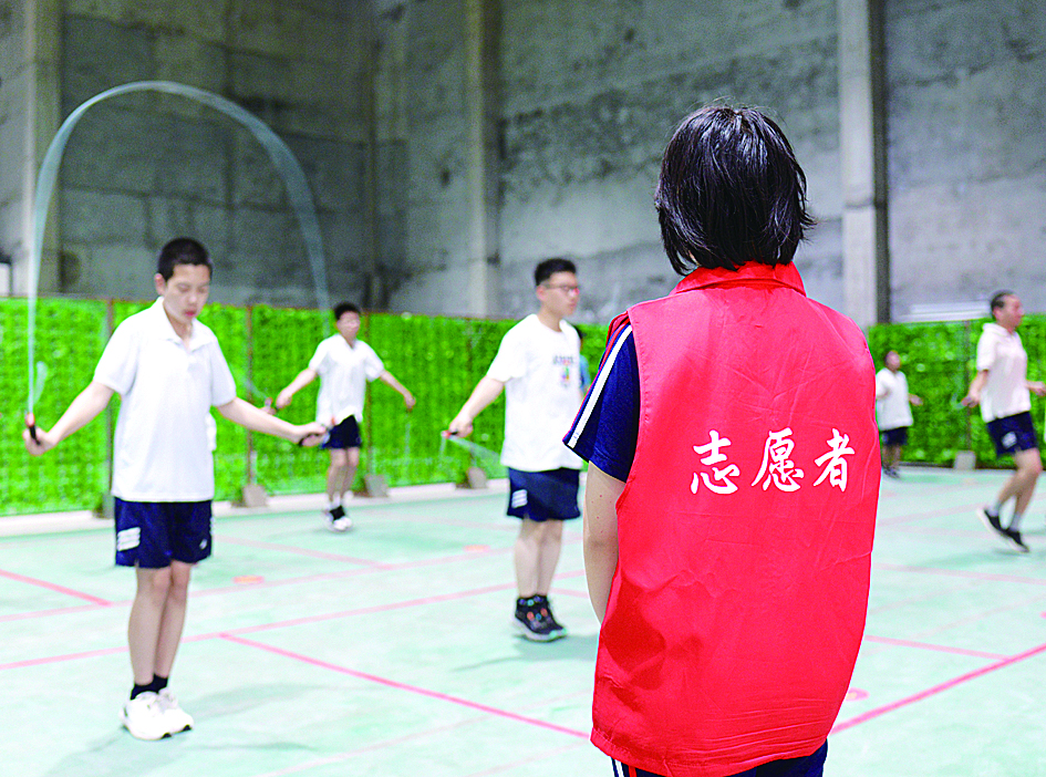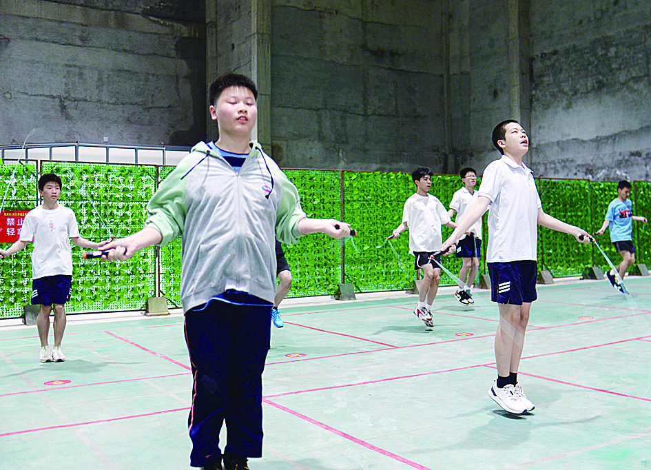 跳绳考场内,塑胶地面上早已画好了16个格子形状的考试点。身穿红马甲的株洲市职工大学志愿者们认真确认每名考生的自动计数跳绳是否归零。一分钟测试开始,16根跳绳几乎同时开始上下翻飞,双脚跳、单脚交替跳,不管哪种跳法,适合自己的就是最好的。