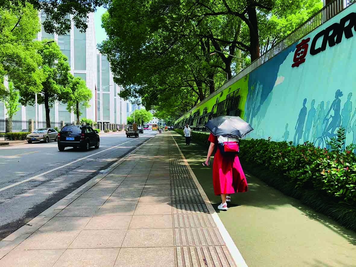 ▲精心设计,厂区文化墙路段的田心小道为绿色。记者 张威 摄