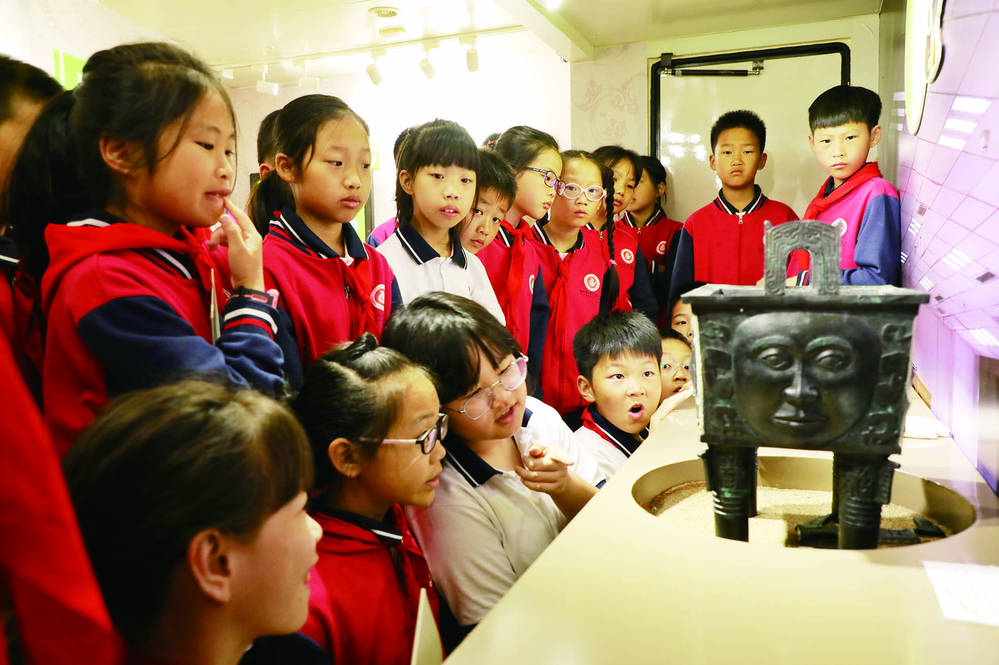 参观“国宝小卫士”展览,观赏人面纹方鼎,现场进行文物模拟修复……今天是国际博物馆日,昨日来自省博物馆的“移动博物馆”车开进市二中附小,给孩子们上了一堂别开生面的历史文化课。