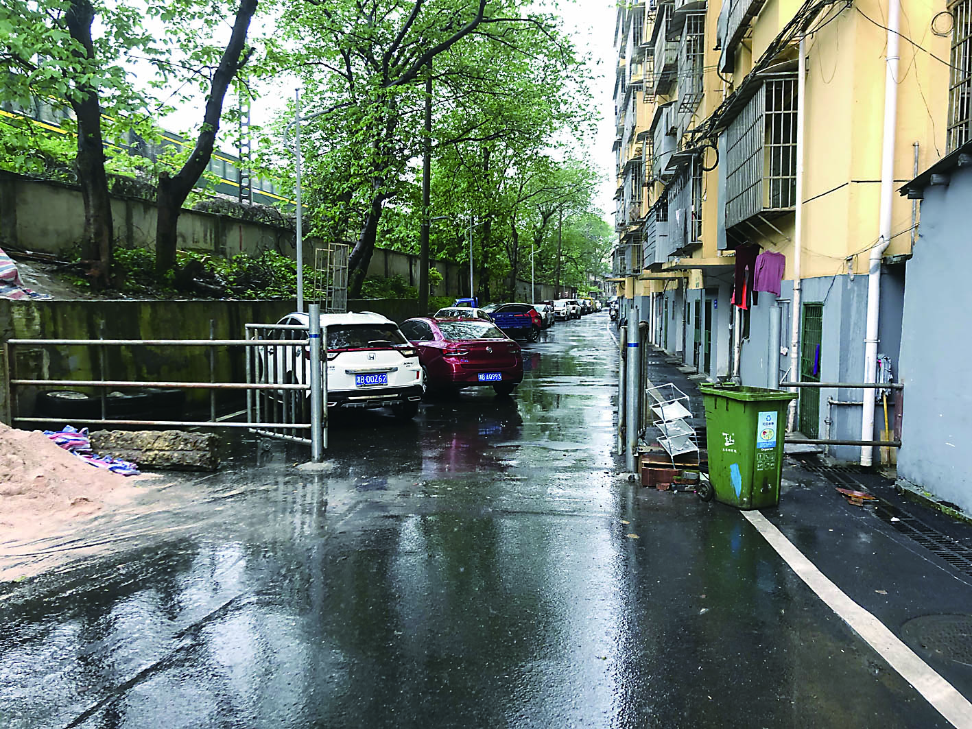 ▲磨子塘小区门前被铁门拦路截断的四通路。 记者 易楚瞳 摄