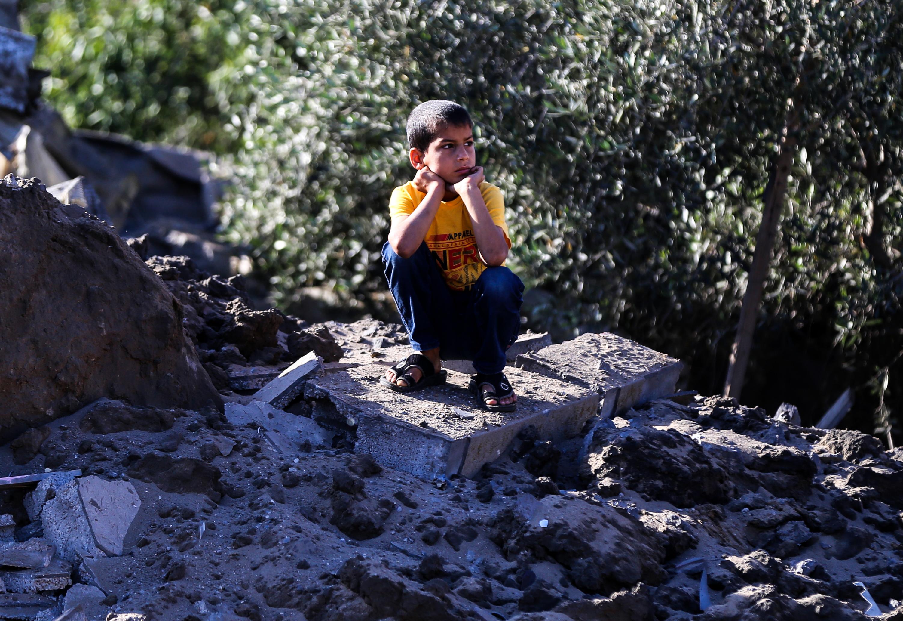 ▲5月18日,在加沙地带城市汗尤尼斯,一名巴勒斯坦儿童蹲在被以军空袭摧毁的一处房屋废墟中。 新华社发(亚西尔 摄)