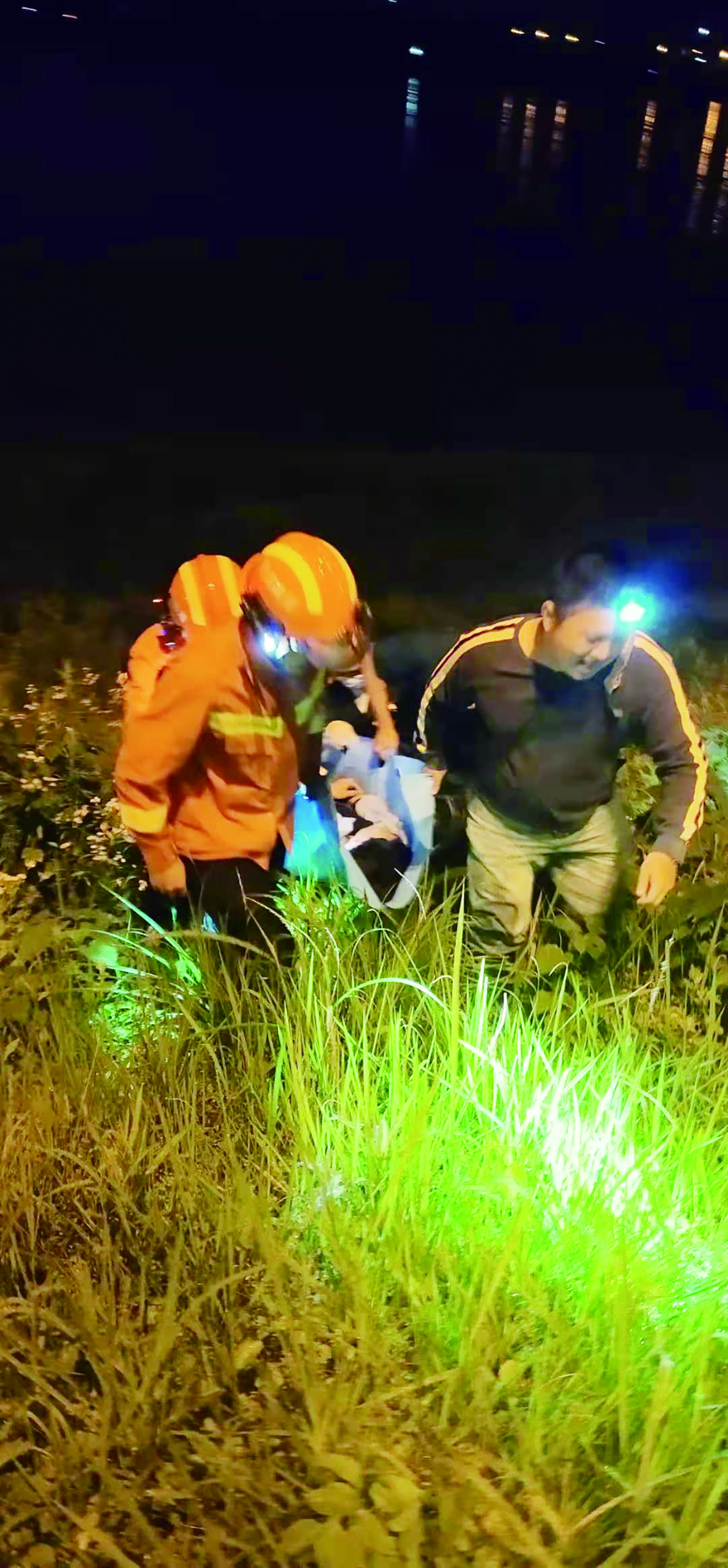 事发时江边有人钓鱼,附近居民王洲红反映,当时他和朋友王秋南正在围观别人钓鱼,先是听到车辆撞击路基的声音,紧接着是一连串底盘与树木的刮擦声,随后一束强光射到河中央。“我心想,坏了,车子要下河。车子一跃下了河堤,灯光也看不到,我们慌张中边跑边打119和120。”王洲红说,此处风光带狭窄,车子下翻很容易落水。他不顾一切径直往岸上跑,希望第一时间接应赶来的消防员和医务人员。王秋南则往车子可能翻落的地方跑,开展救援前期工作。