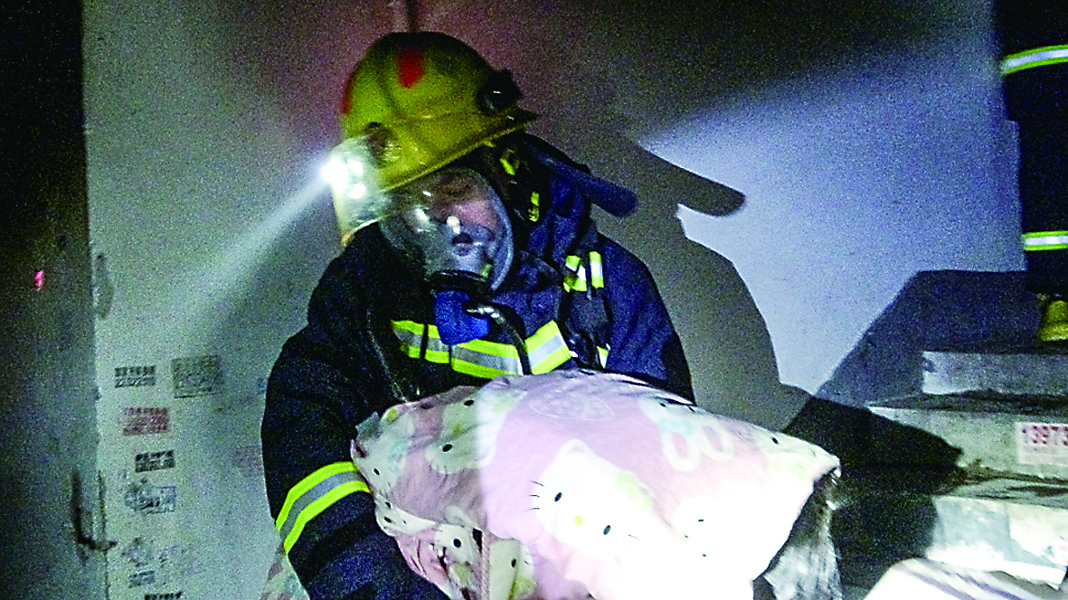 “救救我们,这里有孩子……”在5楼,消防员廖隆辉听到呼救声后,他和队员在房间内发现5名被困人员,其中有2个孩子。其中有个小女孩吸入了大量浓烟,已有些意识不清。廖隆辉找来湿被子将孩子包裹住,紧紧抱着孩子冲下楼,交至医护人员手中。由于吸入大量浓烟,廖隆辉出现了呕吐等不良反应。