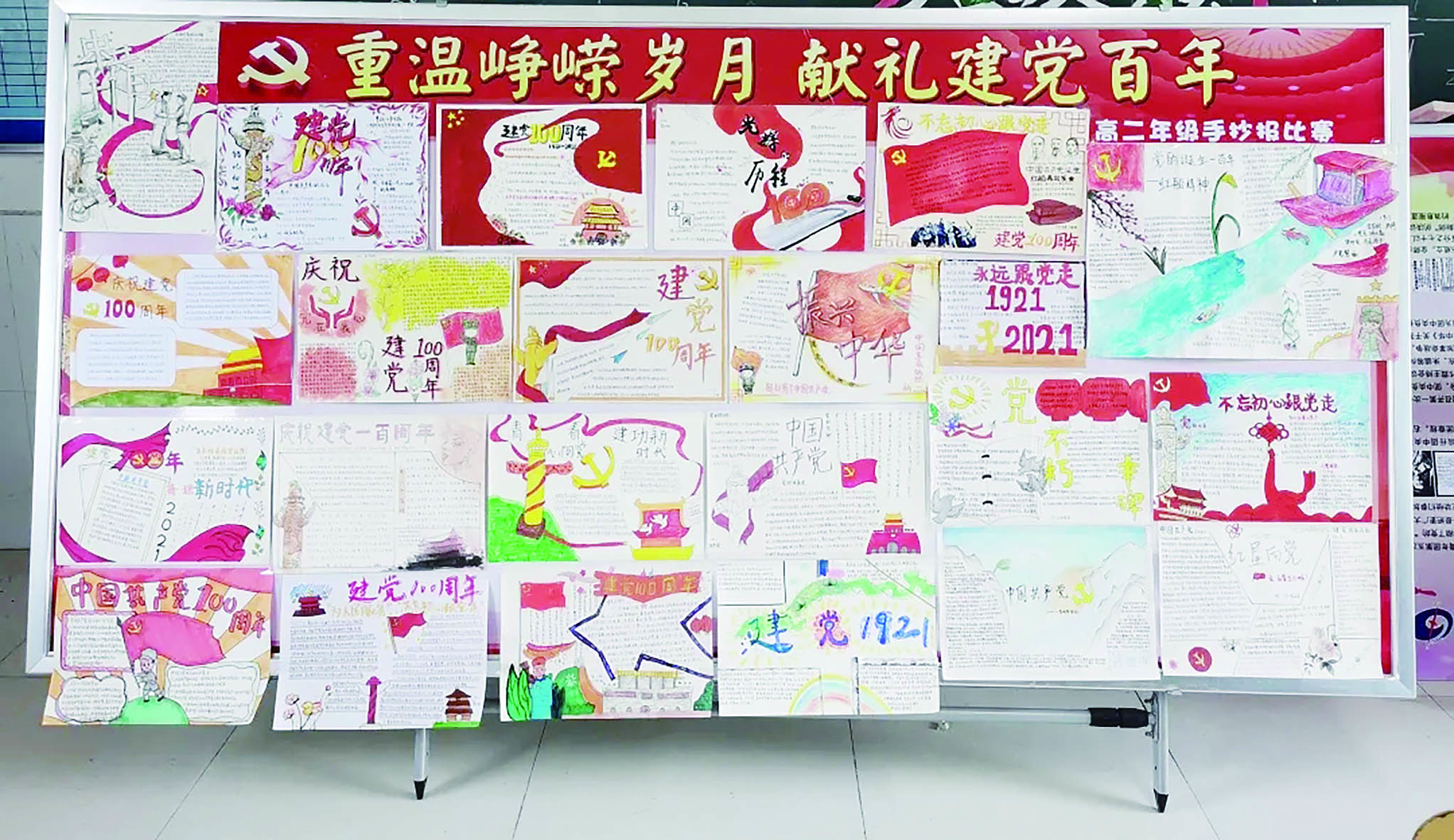 活动开展以来,高二年级全体学生利用课余时间,广泛搜集资料,结合课堂知识,巧妙设计版面,精心描绘图案,创作出了一幅幅表达爱党爱国的优秀作品。他们用画笔描绘出党的发展革命历程,用文字讲述红色精神,用手抄报的形式向建党100周年献礼。