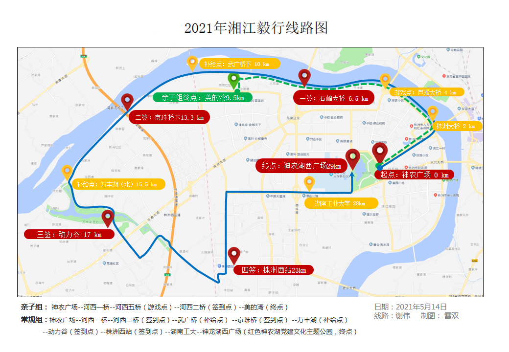 常规组:神农广场——河西一桥——河西二桥(签到点)——武广桥(补给点)——京珠桥(签到点)——万丰湖(补给点)——动力谷(签到点)——株洲西站(签到点)——湖南工大——神农湖西广场(红色神农湖党建文化主题公园,终点),全程23km
