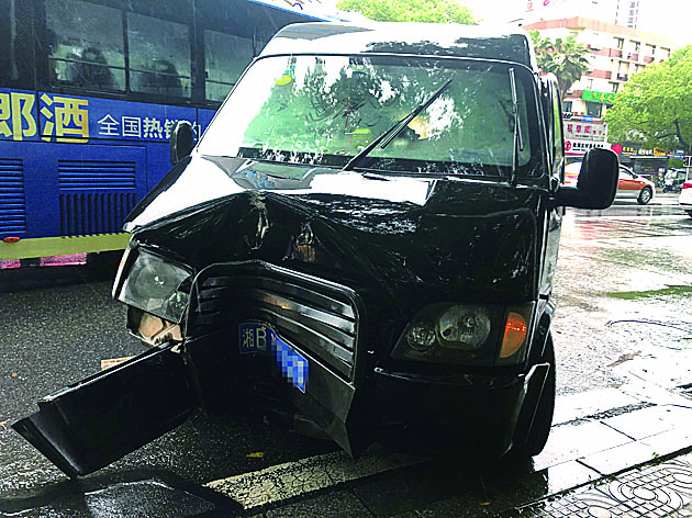 5月19日上午,天元区黄河北路与新闻路交叉口发生一起交通事故:一辆黑色的武装押运车因雨天路滑,失控撞上人行道灯杆,致使该路段交通堵塞。
