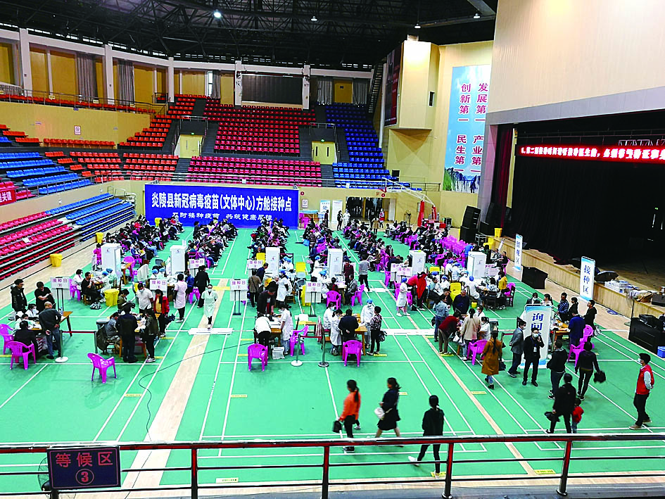 ◀当地百姓在炎陵县文体中心方舱接种点进行集中接种。 通讯员供图