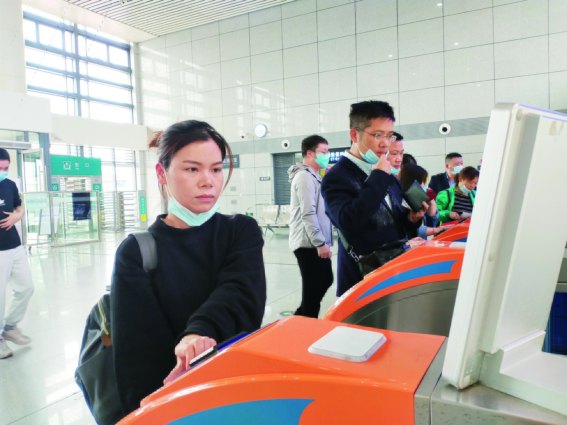 ▲随着票价下调、列车车次增加等公交化措施的推进,长株潭城铁迎来更多“铁粉”。大丰站旅客发送量从2017年的29万余人次猛增至2020年的78万余人次。图为乘客刷身份证准备进入站台。 记者 廖智勇 摄