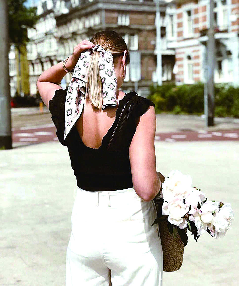 ▲长发的小姐姐想换个造型的话,可以直接在马尾的基础上加根丝巾。
